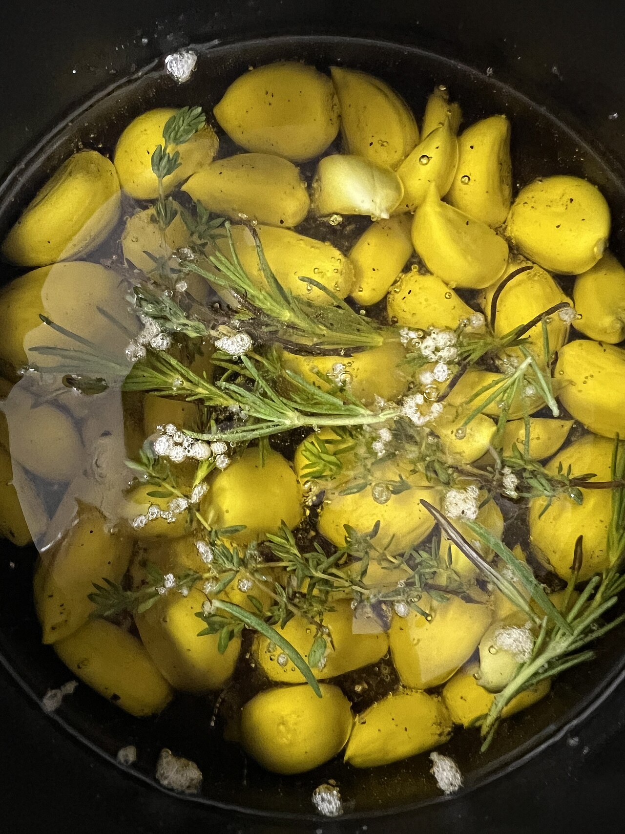 8 min aktivPil alle hvidløg. Læg dem i et lille ovnfast fad. Læg krydderurterne ved og hæld olivenolie over, til hvidløgene er dækkede.